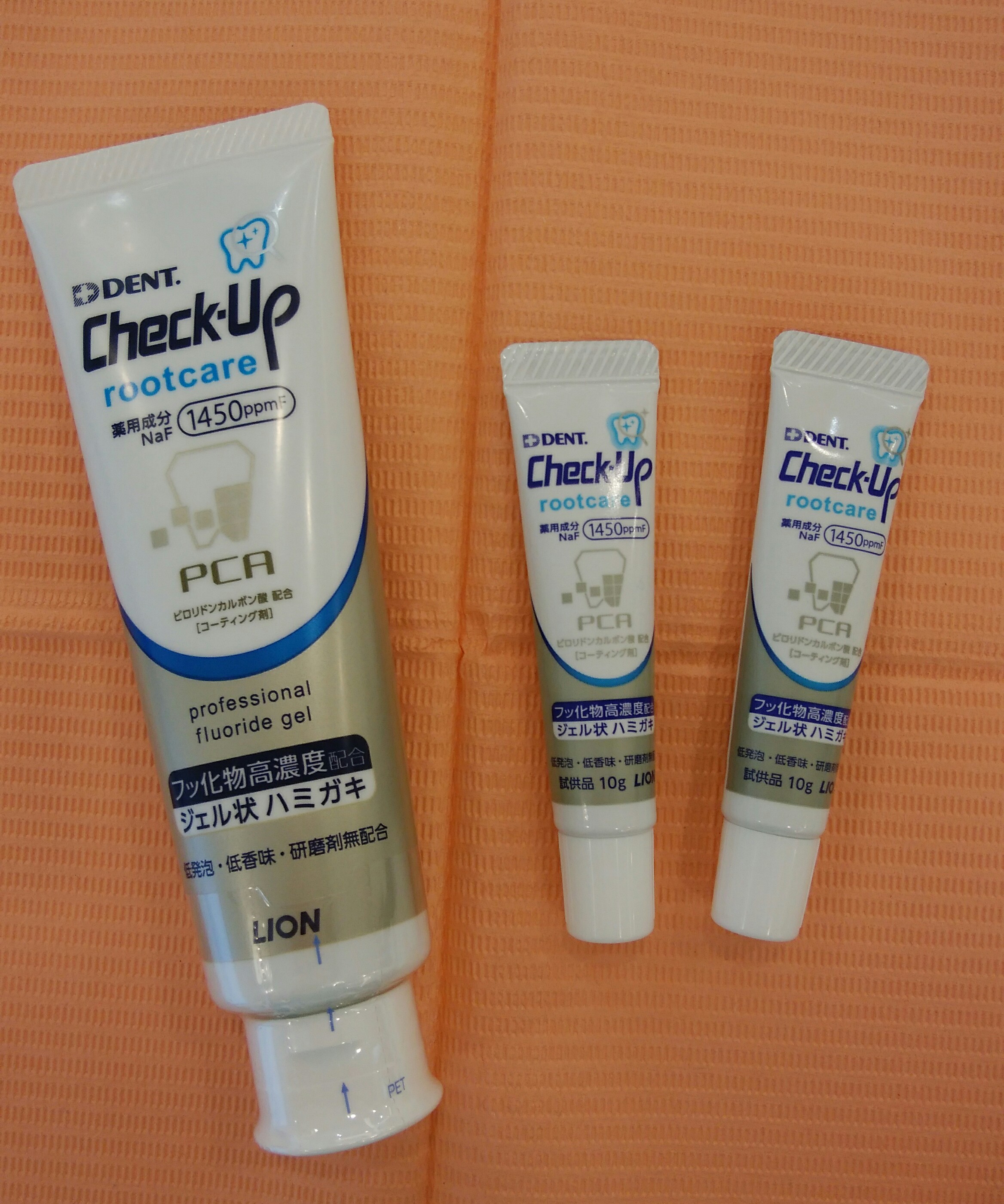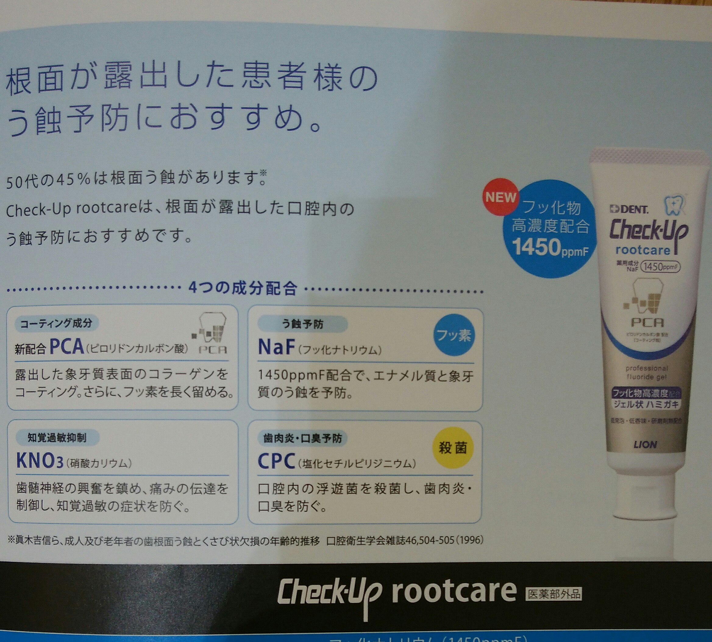 LIONのチェックアップルートケアといいます。 ルートケアとは、歯の根元のケアという意味です。根面が露出した口腔内におすすめの歯磨き粉なのですが、知覚過敏やむし歯、歯肉炎などいろいろなものに効く成分が入っています。